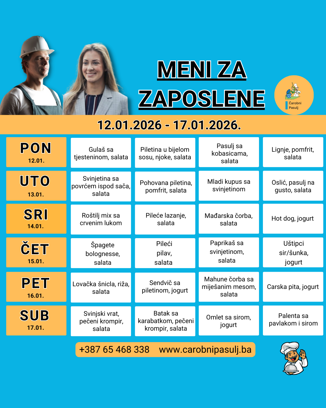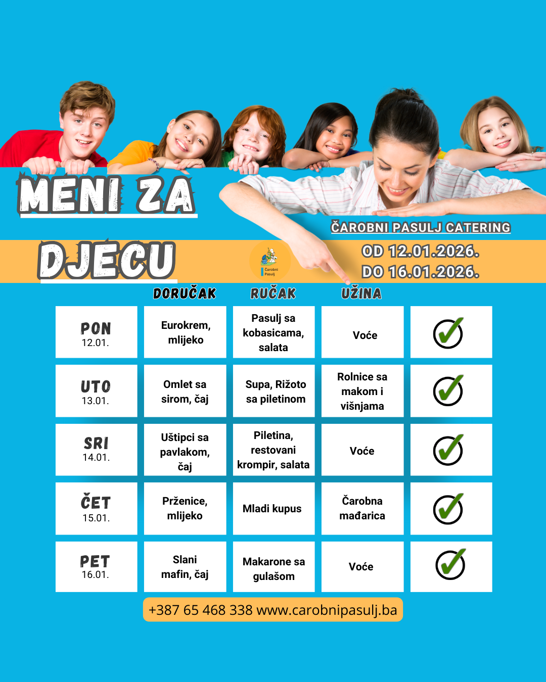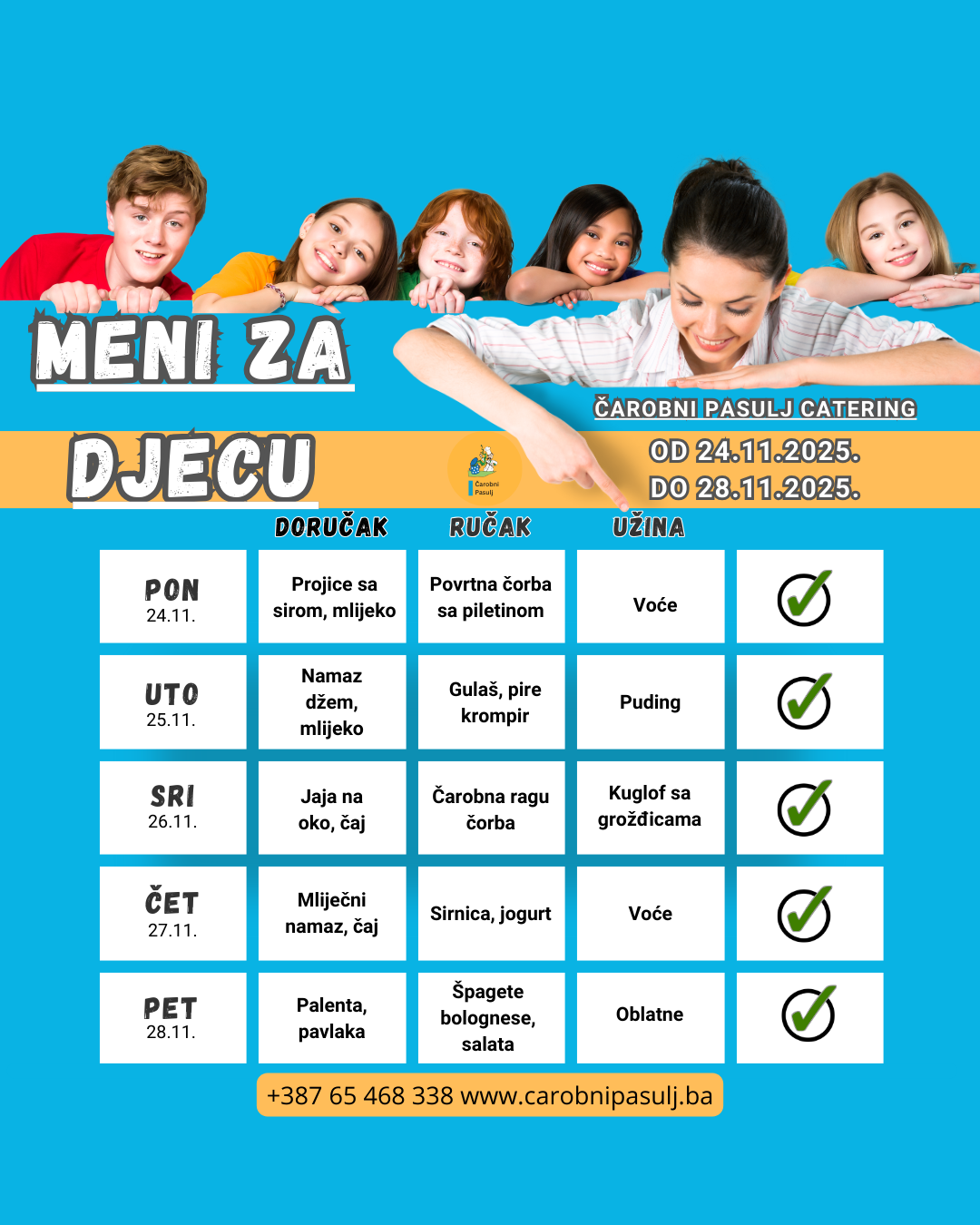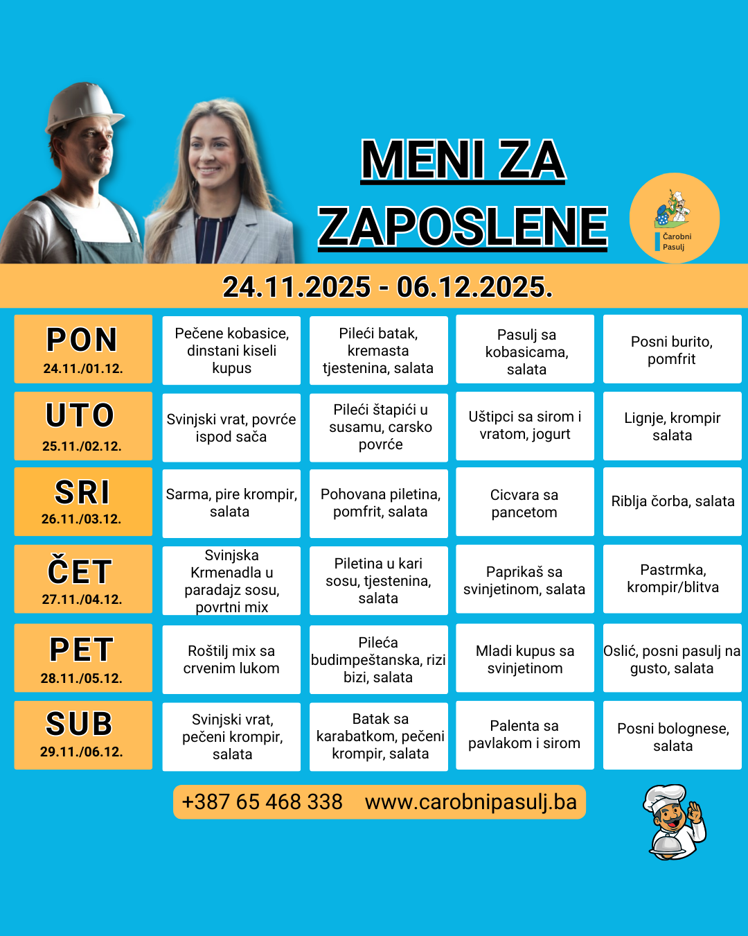 Svake nedjelje u 20h objavljujemo novi jelovnik za narednu sedmicu. Nove jelovnike možete pratiti na našim online kanalima: na web sajtu www.carobnipasulj.ba i društvenim mrežama Facebooku i Instagramu.